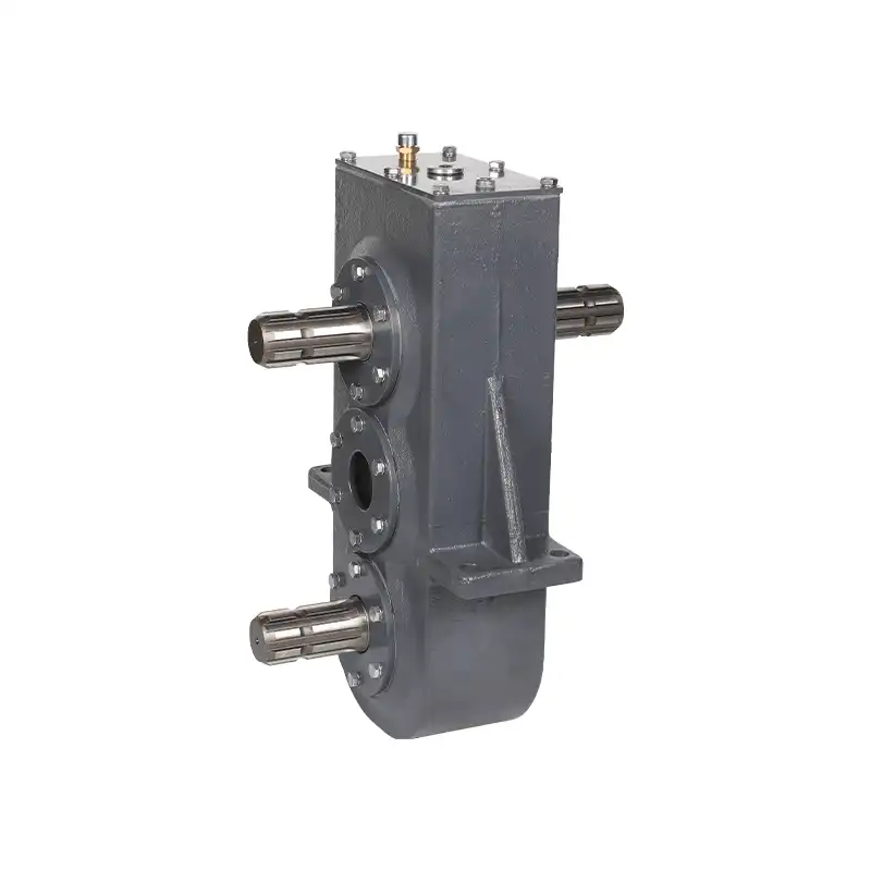 This vertical gearbox is used for the front tractor power input of the crushing large round baler, and the power is transmitted to the machine’s crushing device and baling device through the gearbox. To meet the machine’s operating requirements, the gearbox realizes heightening, enlarged design, multi-axis input, and multi-axis output design, and can be used on different occasions and for multiple needs.